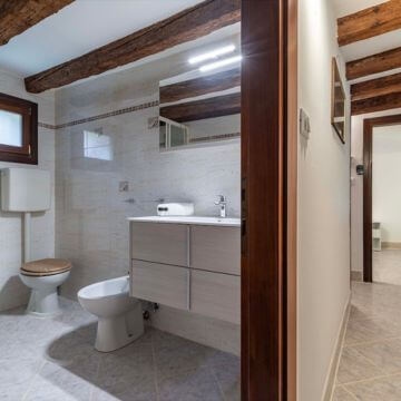 Le travi a vista, l’atmosfera raccolta e la luce naturale creano un ambiente caldo e accogliente, ideale per vivere Venezia con lentezza.