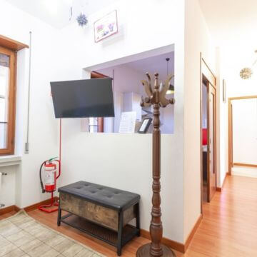Cet appartement bien équipé et au style éclectique offre une atmosphère à la fois fonctionnelle et raffinée. L'entrée s'ouvre sur un long couloir et, grâce à une large ouverture dans le mur, donne sur la cuisine, idéale pour les passionnés de cuisine et de moments conviviaux.